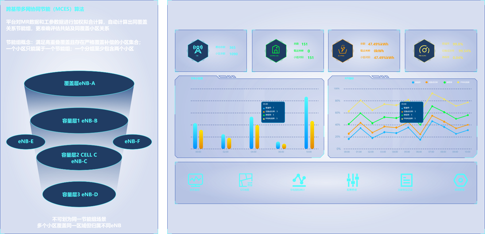 基于小区的同覆盖关系,实时依据业务量和性能指标,在确保对用户感知零影响的前提下,实施小区级别关短和开启操作,实现基站节能。