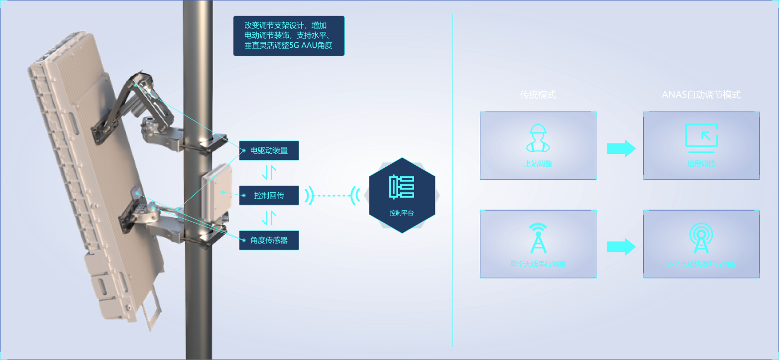 智能天线,改变AAU支架设计,增加自动化组件,实现全自动,高精度,并发搞笑实现调整天线水平和俯仰角度优化网络覆盖。
